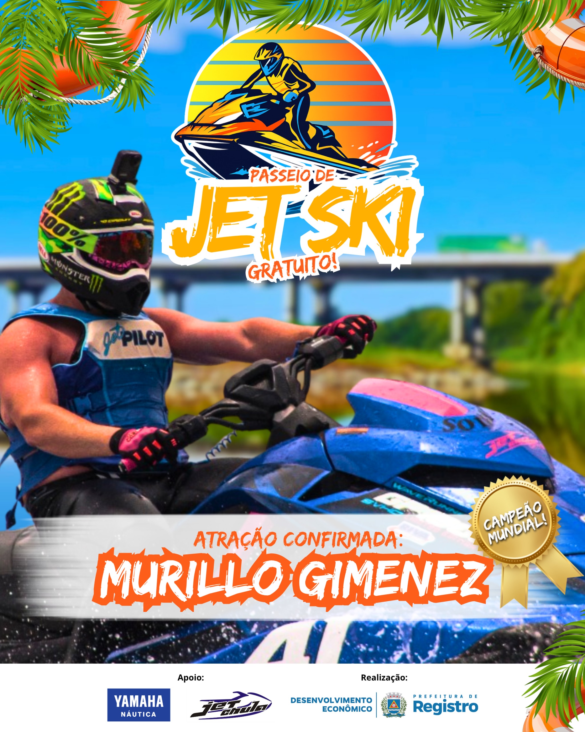 Enquanto Murillo dá o show, moradores e turistas poderão sentir a adrenalina na pele. Serão oferecidos passeios gratuitos de jet ski, com saídas da rampa náutica próxima ao Mirante. O detalhe: você vai na garupa de pilotos profissionais, garantindo aquela sensação de velocidade com total segurança.