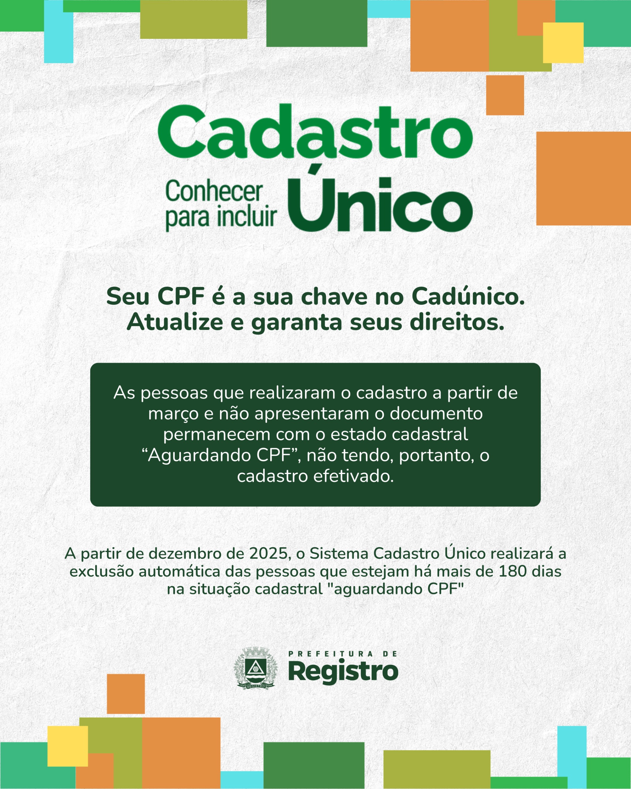 Registro (SP) — O Cadastro Único (CadÚnico) passou a excluir automaticamente, desde dezembro, os registros de pessoas que permanecem há mais de 180 dias na situação “aguardando CPF”, conforme regra nacional adotada pelo Ministério do Desenvolvimento e Assistência Social (MDS). A medida atinge cidadãos que iniciaram o cadastro após março de 2025 e não apresentaram o documento dentro do prazo, o que impede a validação da inscrição e pode levar à perda de benefícios sociais.