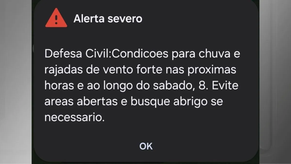 O aviso, que traz o texto “Condições para chuva e rajadas de vento forte nas próximas horas e ao longo de sábado (8). Evite áreas abertas e busque abrigo se necessário”, foi disparado para todas as cidades do Vale do Ribeira, além da Grande São Paulo, Baixada Santista e demais regiões afetadas.