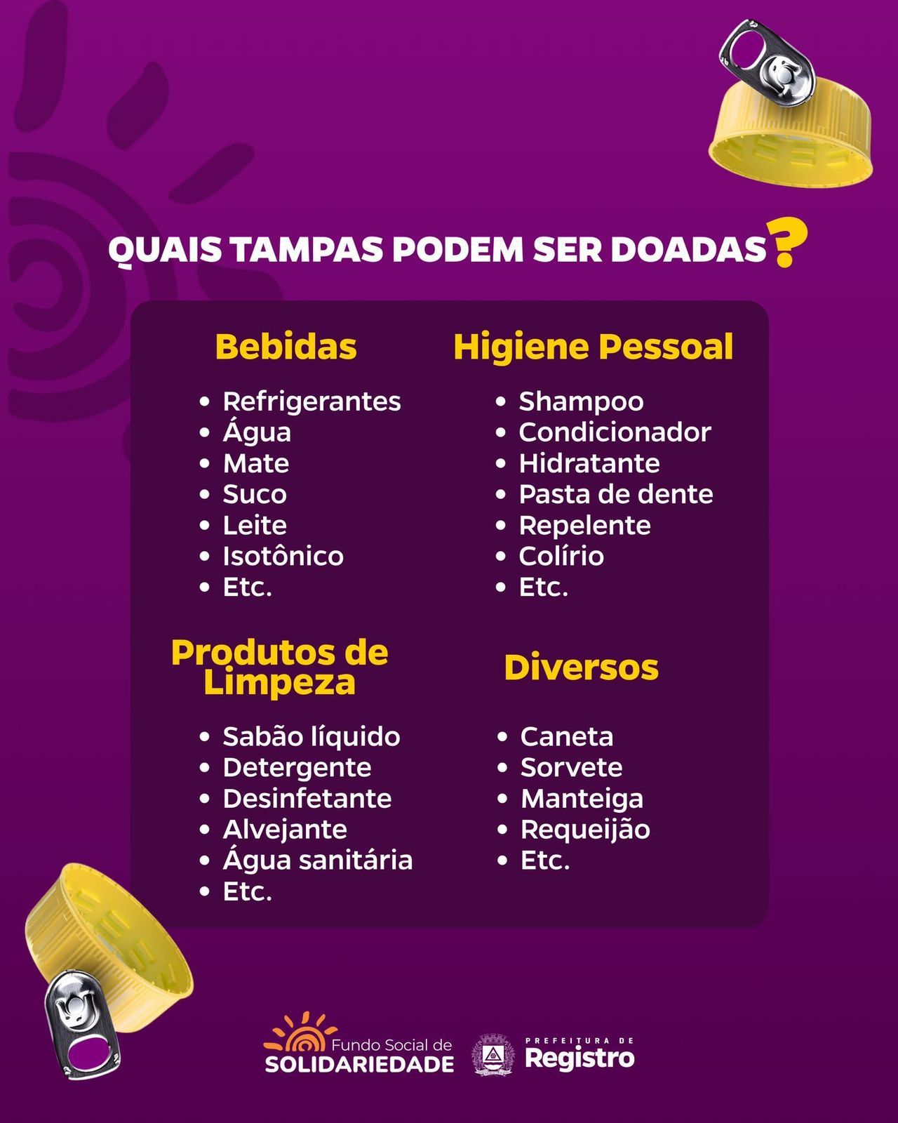 O Fundo Social de Solidariedade de Registro mantém ativa a campanha “Doe Tampas, Salve Patas”, em apoio ao Grupo de Proteção aos Animais do Vale do Ribeira (GPA-VR). A iniciativa busca envolver a comunidade na arrecadação de tampinhas plásticas de produtos de limpeza e alimentícios, além de tampinhas de garrafas PET e lacres de alumínio.