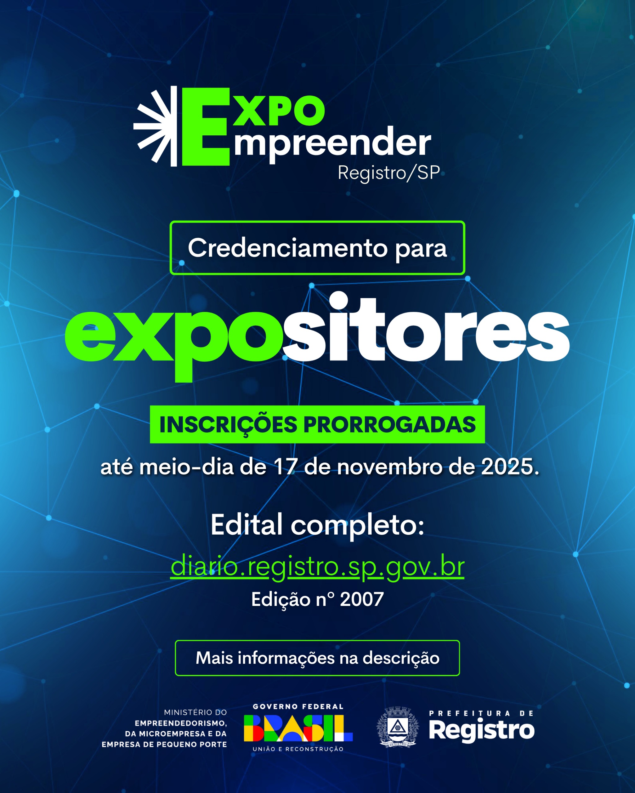 A Prefeitura de Registro anunciou a prorrogação das inscrições para expositores da tradicional feira de negócios da cidade, agora chamada Expo Empreender. O novo prazo vai até segunda-feira (17), ao meio-dia, e as inscrições devem ser feitas exclusivamente pelo Protocolo Online do município.