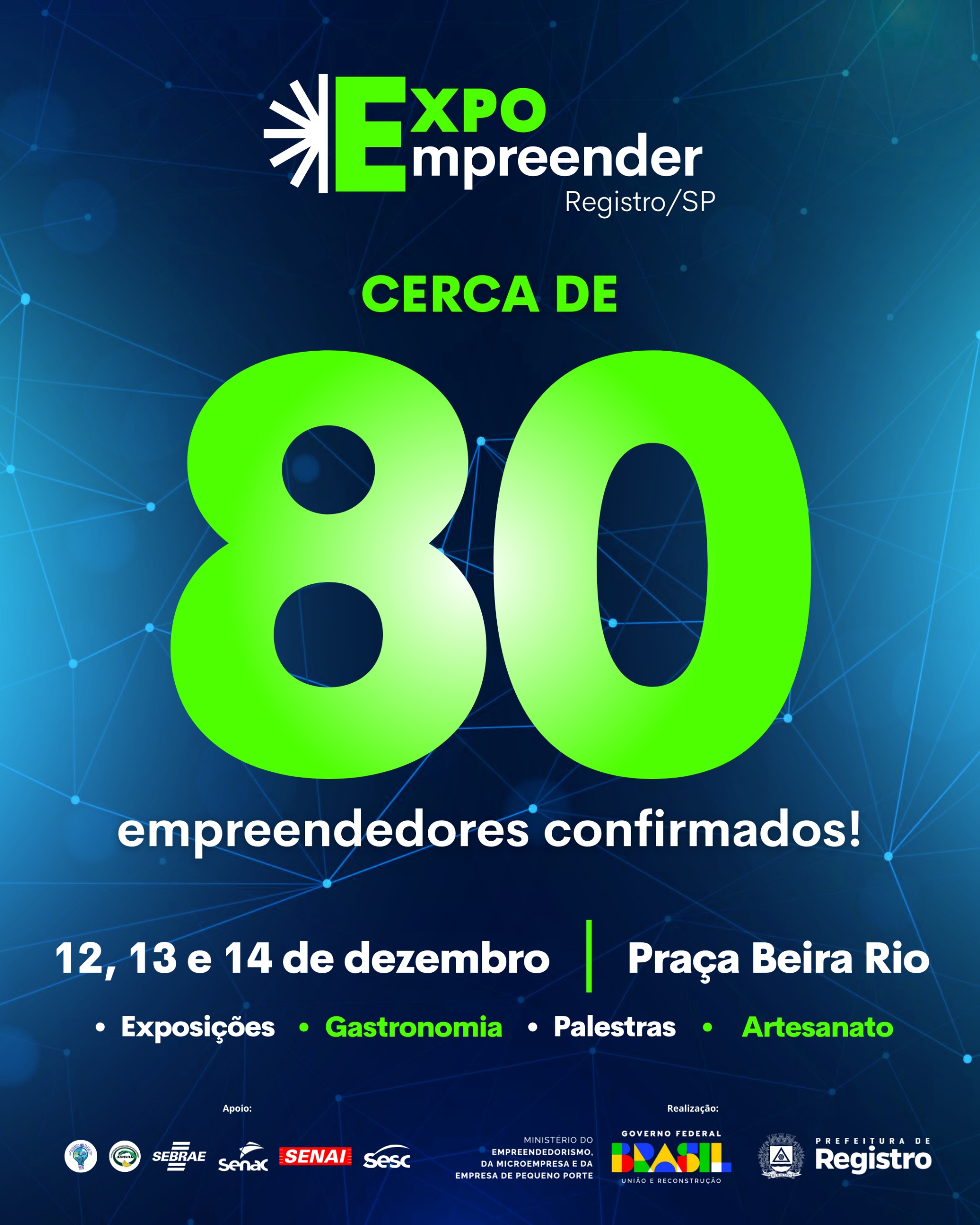 A cidade de Registro recebe, entre os dias 12 e 14 de dezembro, a Expo Empreender, evento voltado à valorização do empreendedorismo local e à promoção da economia do município. Com cerca de 80 empreendedores, a feira ocupará a Praça Beira Rio e contará com estandes de produtores de chá, artesãos, prestadores de serviços, iniciativas de turismo, fornecedores de equipamentos, empresas de tecnologia e uma diversificada praça de alimentação.