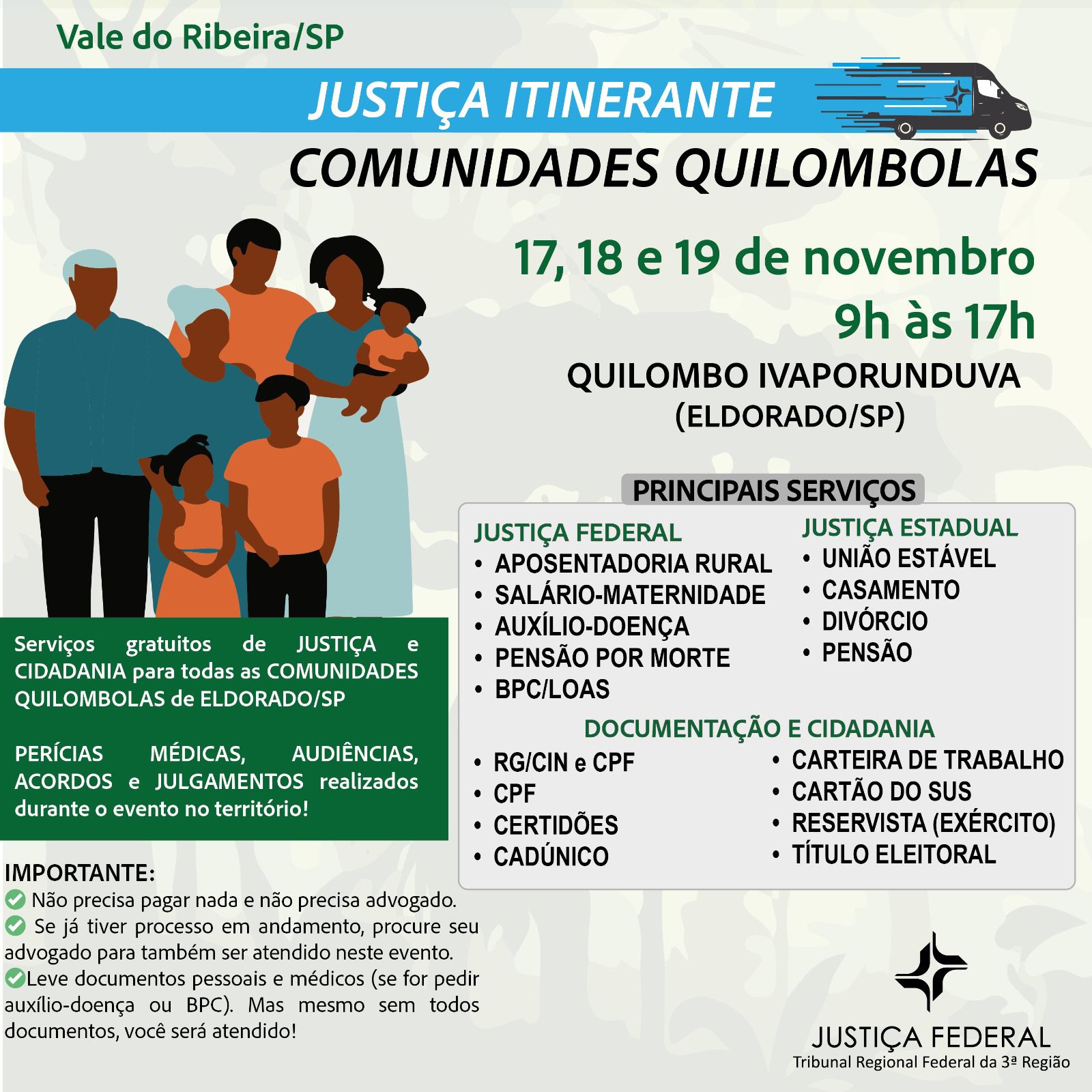 O Tribunal Regional da Federal da 3ª Região (TRF3) e a Seção Judiciária de São Paulo (SJSP) promovem, entre os dias 17 e 19 de novembro, a primeira edição do Juizado Especial Federal (JEF) Itinerante Quilombola. Os atendimentos vão ocorrer das 9h às 17h na Pousada do Quilombo Ivaporunduva, em Eldorado/SP, Vale do Ribeira.