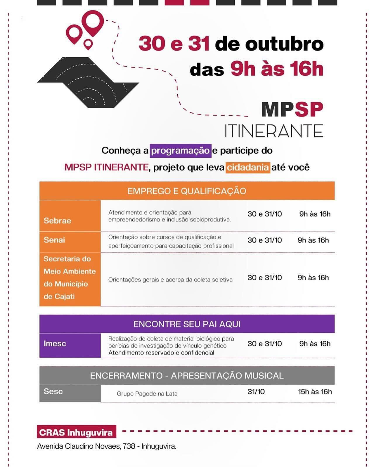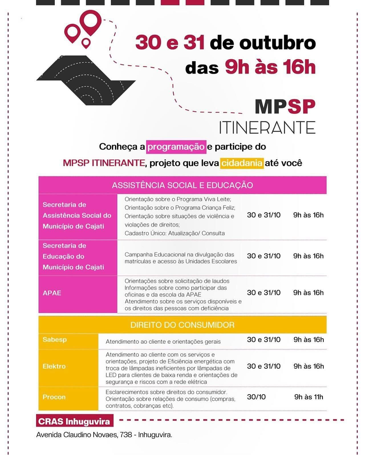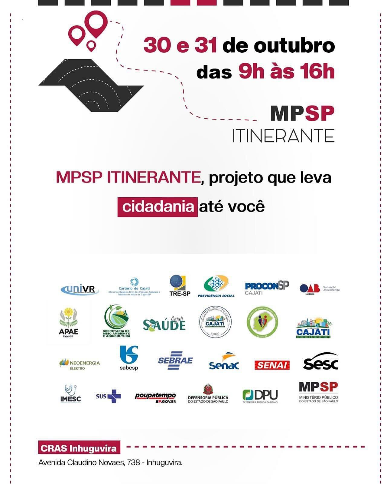O Ministério Público do Estado de São Paulo (MP-SP) convida toda a população de Cajati e região para participar do MP Itinerante – Cidadania Plena no Vale do Ribeira, nos dias 30 e 31 de outubro, das 9h às 16h. O evento será realizado no CRAS Inhuguvira e reunirá mais de 20 parceiros institucionais, oferecendo atendimentos gratuitos, orientação jurídica, serviços de saúde, emissão de documentos, educação, assistência social, qualificação profissional e muito mais.