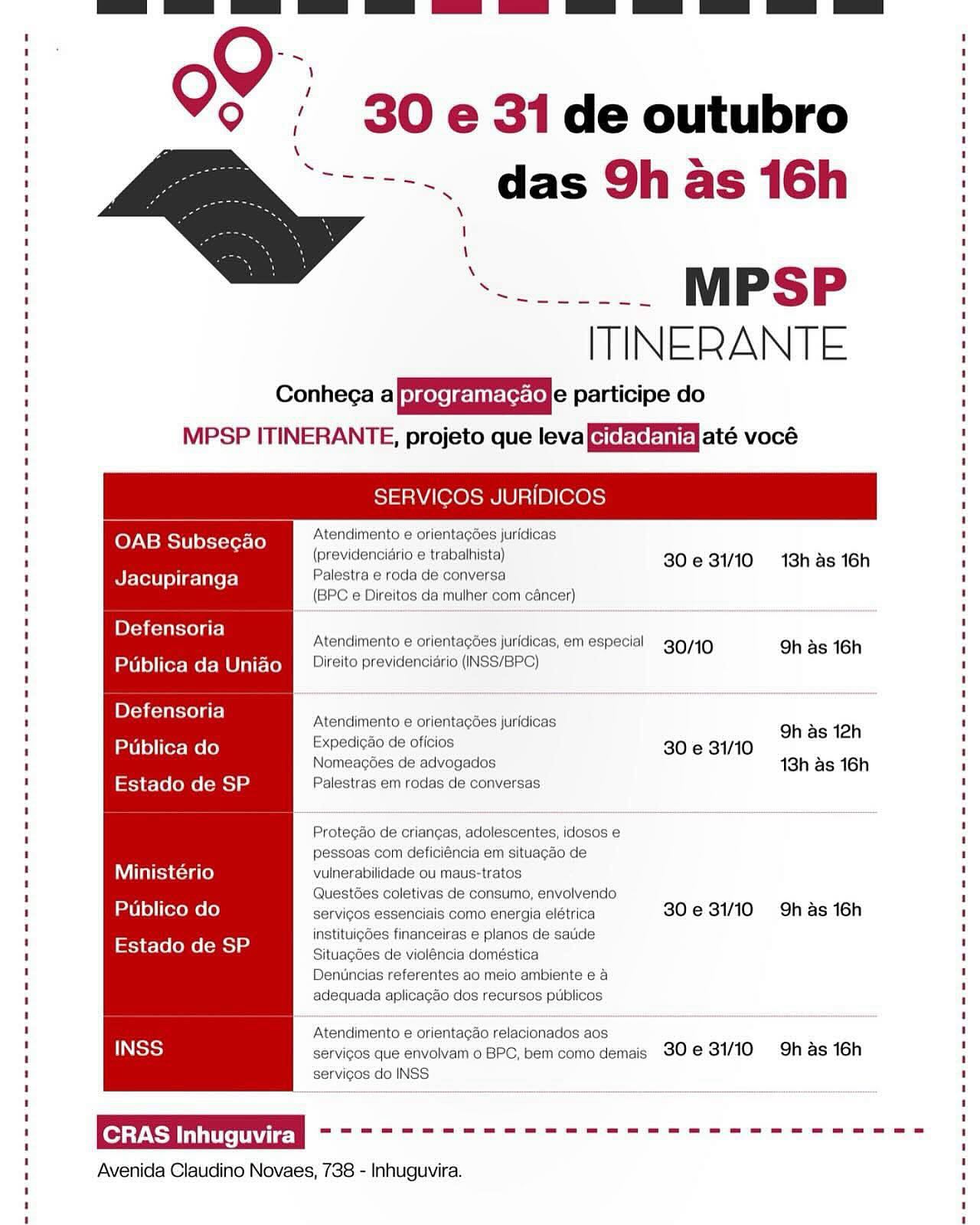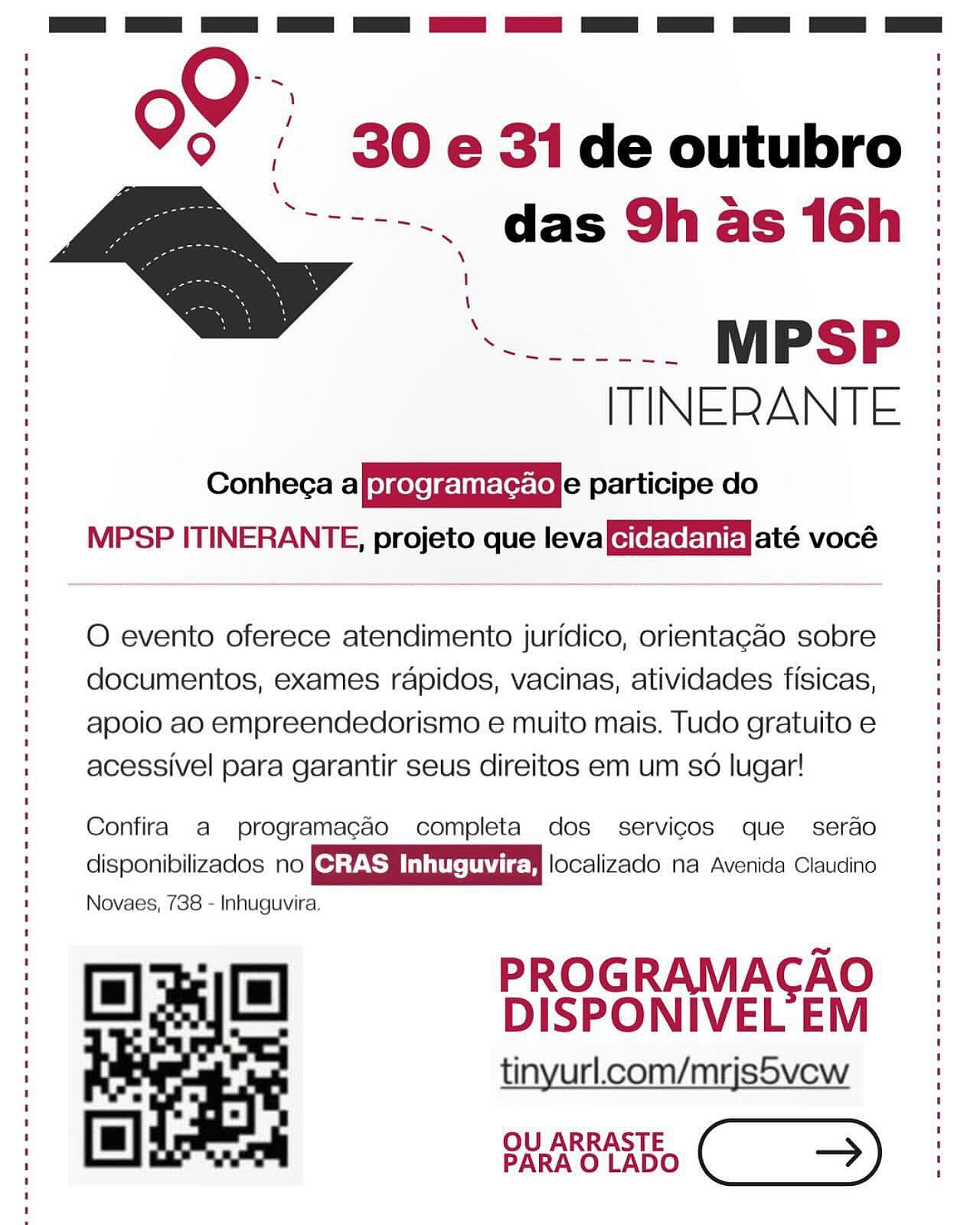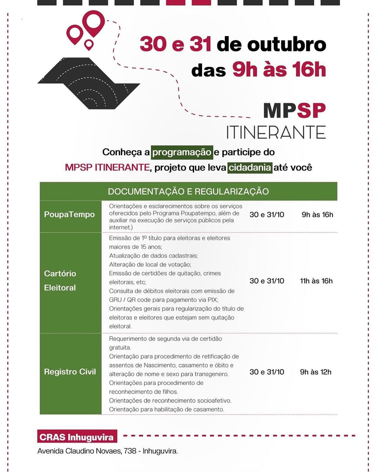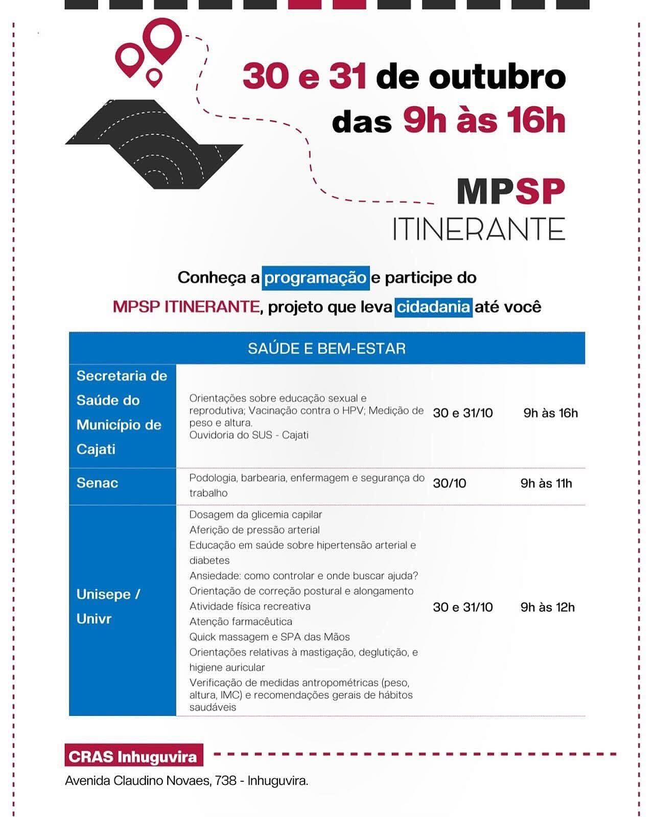 O Ministério Público do Estado de São Paulo (MP-SP) convida toda a população de Cajati e região para participar do MP Itinerante – Cidadania Plena no Vale do Ribeira, nos dias 30 e 31 de outubro, das 9h às 16h. O evento será realizado no CRAS Inhuguvira e reunirá mais de 20 parceiros institucionais, oferecendo atendimentos gratuitos, orientação jurídica, serviços de saúde, emissão de documentos, educação, assistência social, qualificação profissional e muito mais.