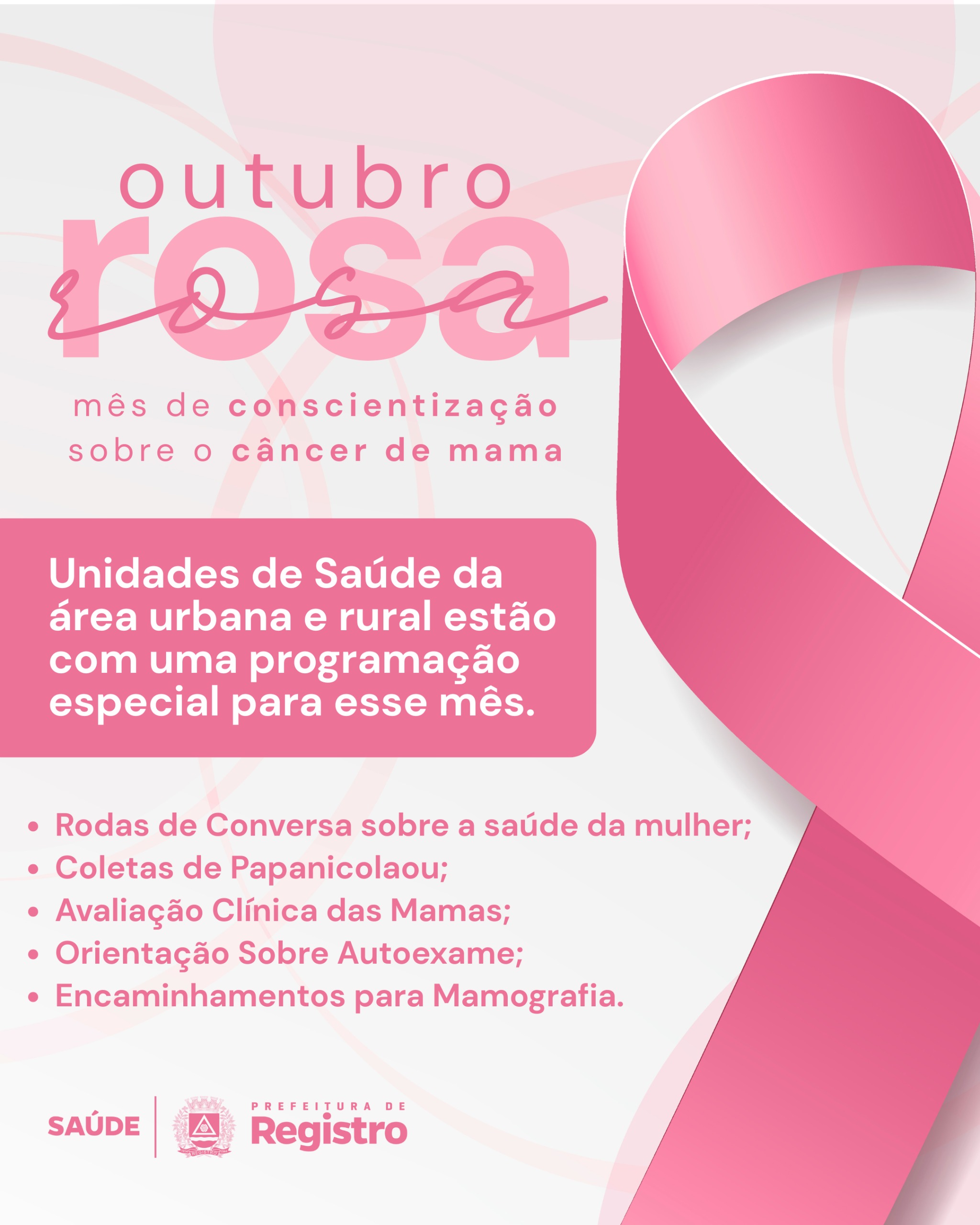 A campanha Outubro Rosa chegou a Registro (SP) com uma programação especial organizada pela Prefeitura, por meio da Secretaria Municipal de Saúde, em todas as Unidades de Saúde do município. O objetivo é ampliar o cuidado integral, oferecer informações sobre saúde feminina e reforçar a importância da prevenção e do diagnóstico precoce do câncer de mama.