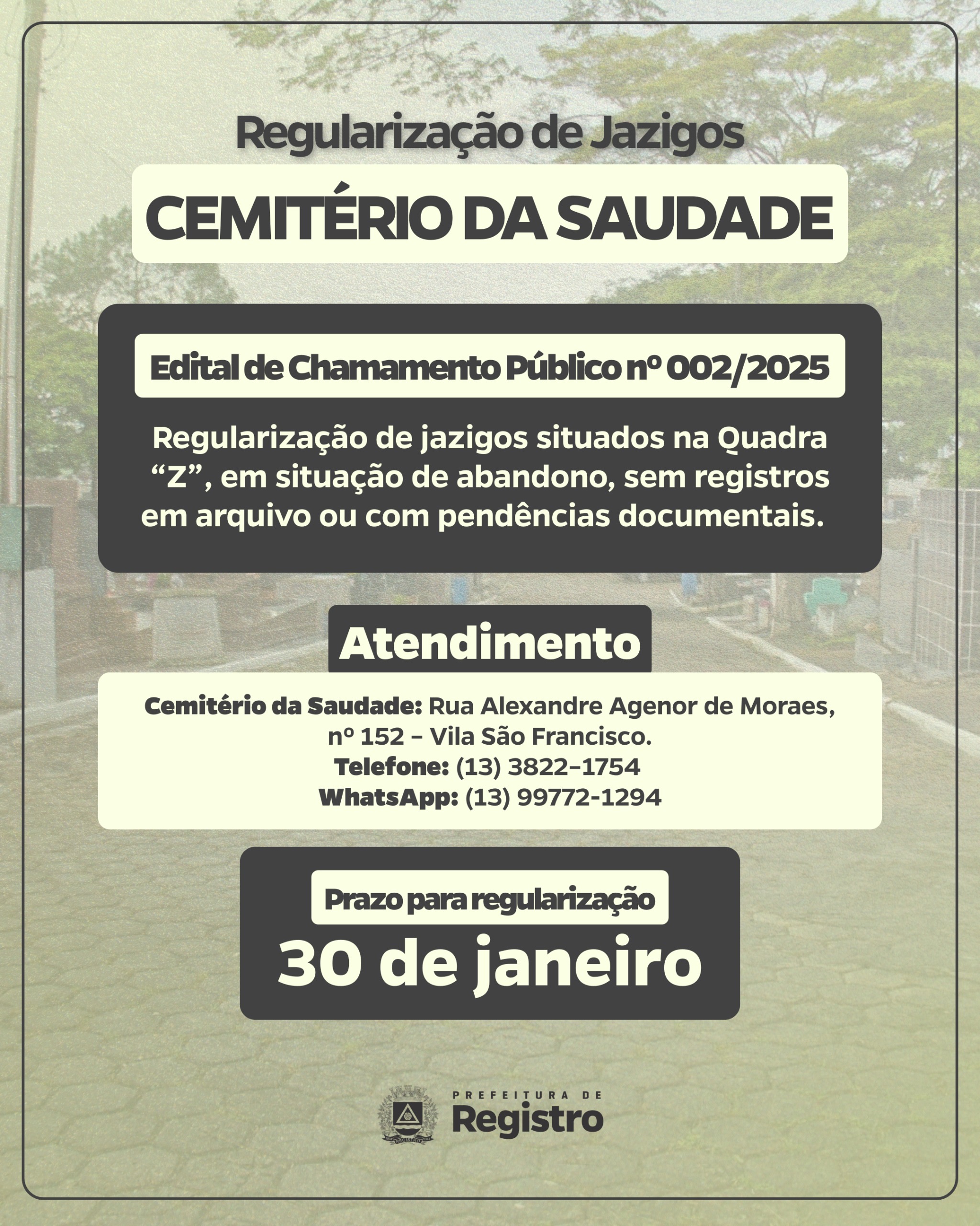 A Prefeitura de Registro emitiu um reforço na convocação para que concessionários, arrendatários ou sucessores de jazigos no Cemitério da Saudade regularizem a situação de seus lotes. O prazo final para a apresentação da documentação termina na próxima sexta-feira, 30 de janeiro.
