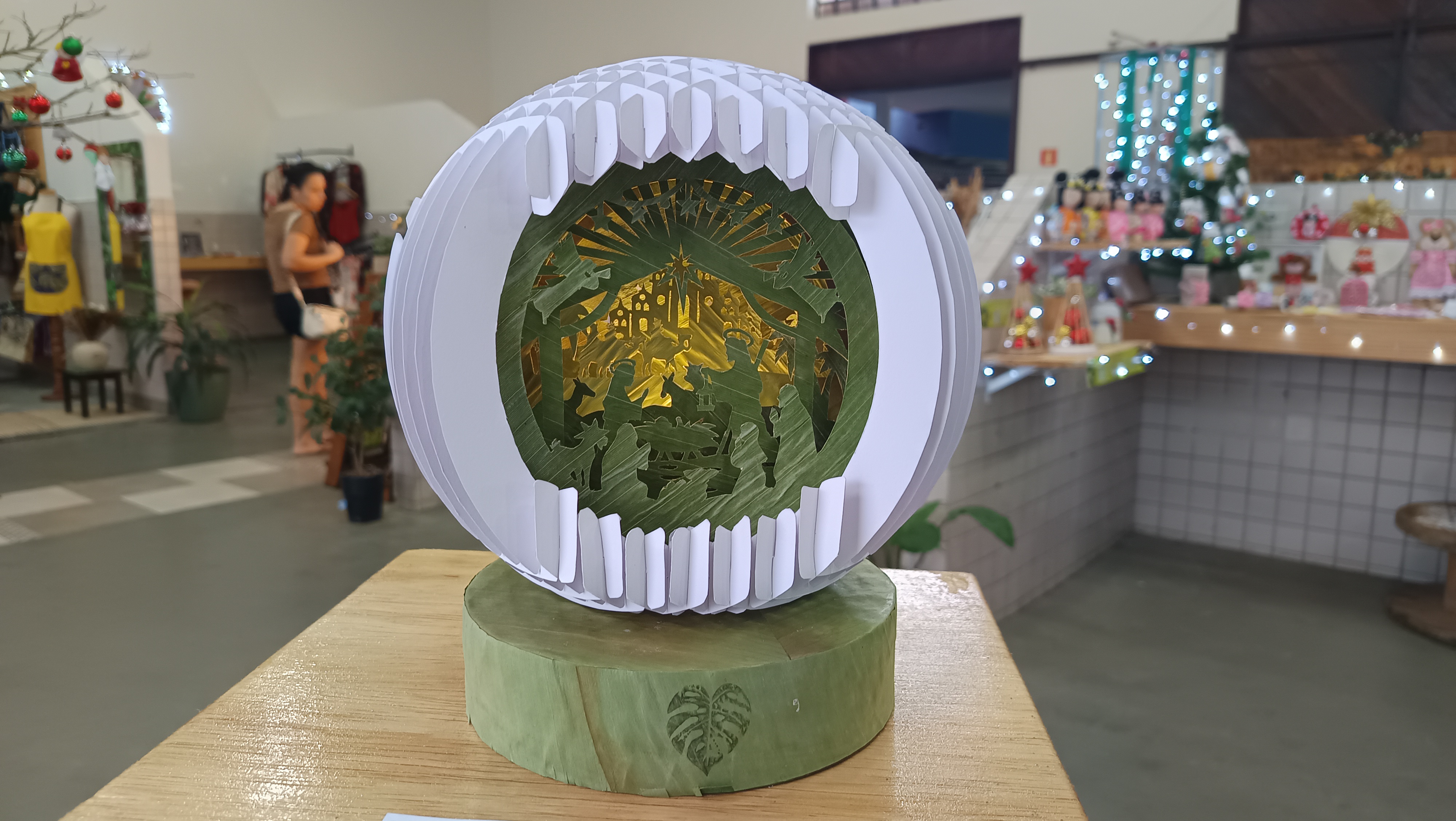 Nas mãos habilidosas de artesãos de Sete Barras, Itaóca e Iguape, a tradição do presépio ganhou novas formas e materiais, revelando a riqueza cultural do Vale do Ribeira. A vencedora do concurso, Cintia Midori Shirata Habe, de Sete Barras, impressionou o público com um presépio feito em delicadas folhas de bananeira recortadas com bisturi. Com as folhas sobrepostas em uma estrutura de papel, a obra também funciona como luminária, irradiando luz e simbolismo.