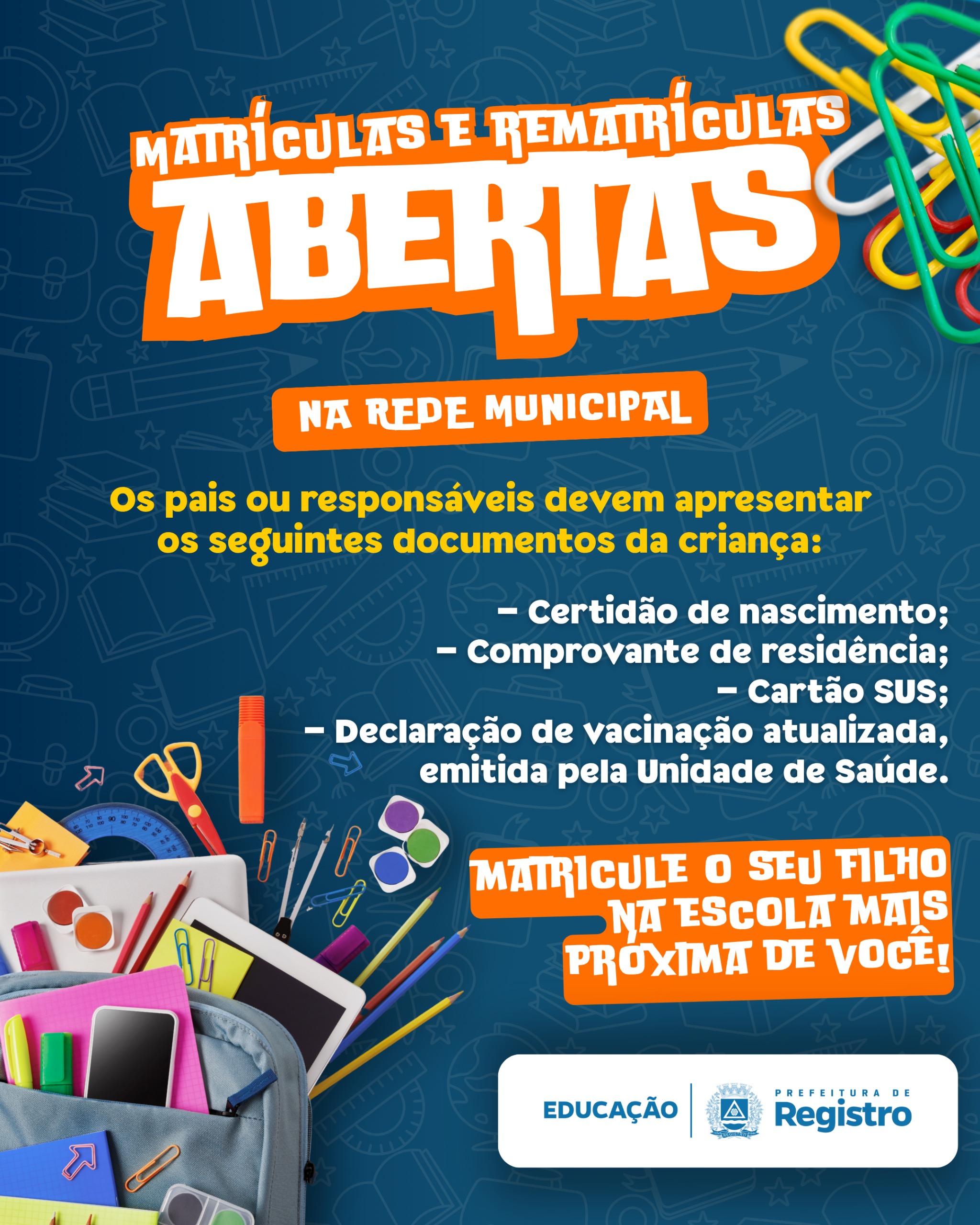 A Prefeitura de Registro (SP) abriu as inscrições para matrículas e rematrículas nas escolas e creches da rede municipal para o ano letivo de 2026. Pais e responsáveis devem se dirigir às unidades de ensino mais próximas da residência da criança para garantir a vaga.
