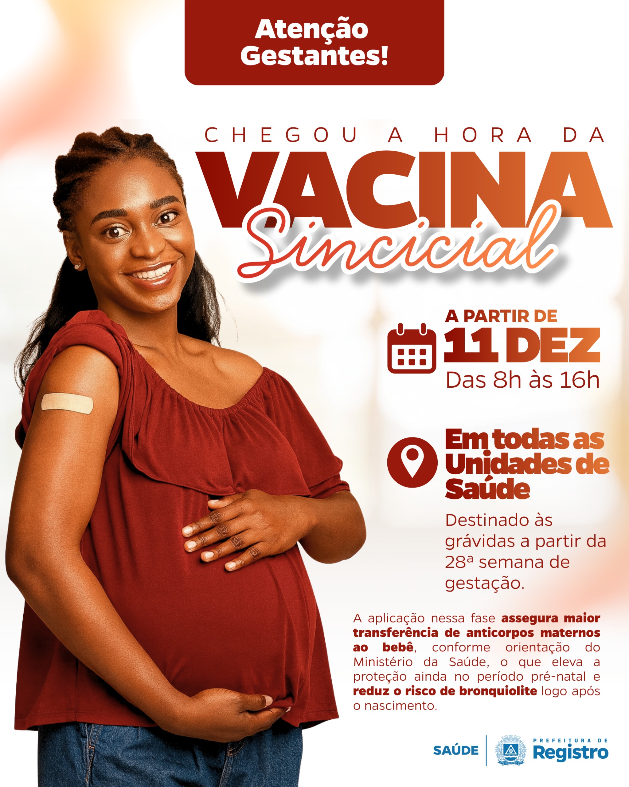 A cidade de Registro, no interior de São Paulo, começou nesta quinta-feira (11) a aplicação da vacina contra o Vírus Sincicial Respiratório (VSR) em gestantes a partir da 28ª semana de gestação. O imunizante já está disponível em todas as Unidades de Saúde do município pelo Sistema Único de Saúde (SUS). A medida segue orientação do Ministério da Saúde e tem como objetivo proteger recém-nascidos de infecções respiratórias graves, como bronquiolite e pneumonia — responsáveis por grande parte das internações infantis no país.