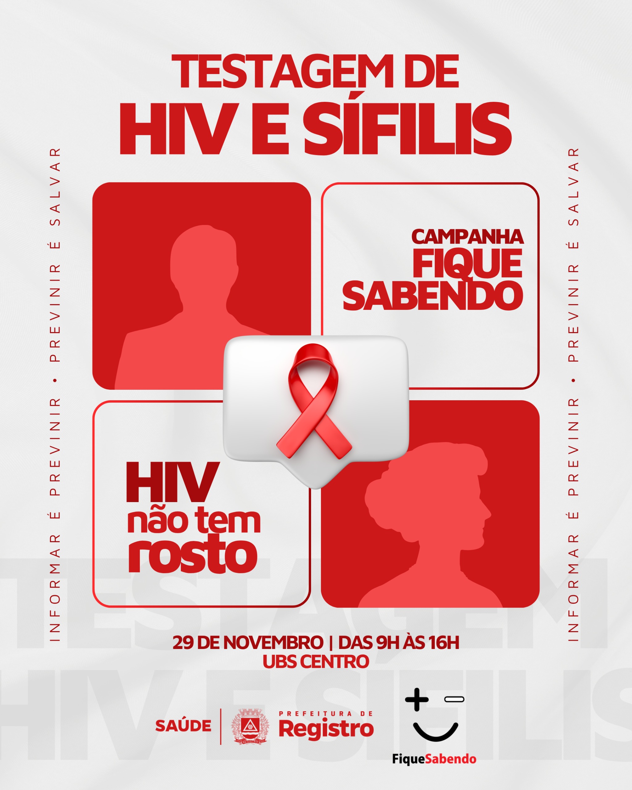 A Prefeitura de Registro (SP), por meio da Secretaria Municipal de Saúde, realiza no dia 29 de novembro (sábado), das 9h às 16h, uma ação gratuita de testagem para HIV e sífilis na UBS Centro, localizada na Av. Clara Gianotti de Souza, 345. A iniciativa faz parte da 18ª edição da Campanha Estadual Fique Sabendo, promovida anualmente pelo Governo do Estado de São Paulo, e tem como objetivo ampliar o acesso ao diagnóstico, incentivar a prevenção e garantir tratamento imediato nos casos positivos.