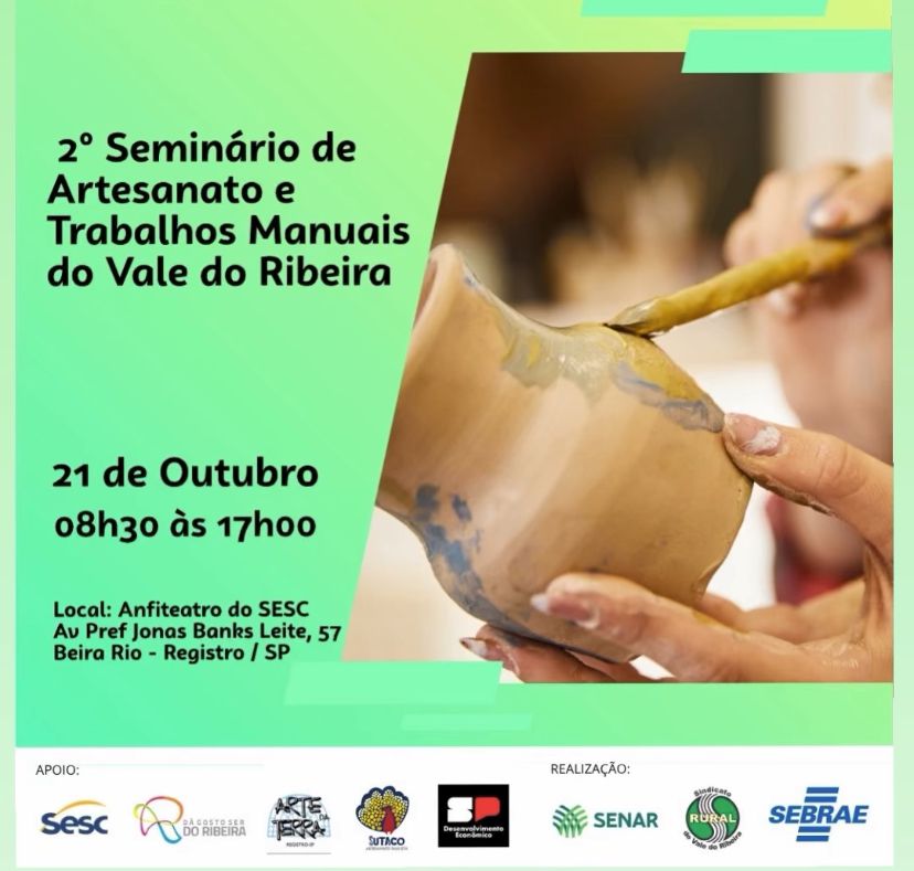 O Sebrae-SP e o Senar/Sindicato Rural realizam, no dia 21 de outubro, o 2º Seminário de Artesanato e Trabalhos Manuais do Vale do Ribeira, com foco em fortalecer e diversificar o setor artesanal da região. O evento será das 8h30 às 17h, no Anfiteatro do Sesc Registro, e as inscrições são gratuitas até 19 de outubro, pelo link https://bit.ly/inscrição-artesanato.