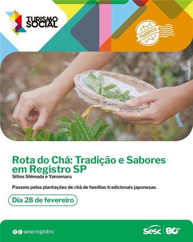 O Sesc Registro está com inscrições abertas para uma imersão cultural e sensorial pela Rota do Chá, passeio que explora a história e a produção da única região do Brasil a manter o cultivo tradicional da Camellia sinensis (planta que dá origem aos chás verde e preto). A atividade, que faz parte do programa de Turismo Social, acontece no dia 28 de fevereiro (sábado).