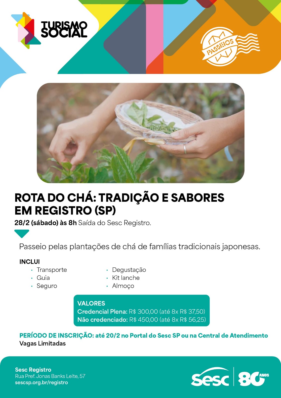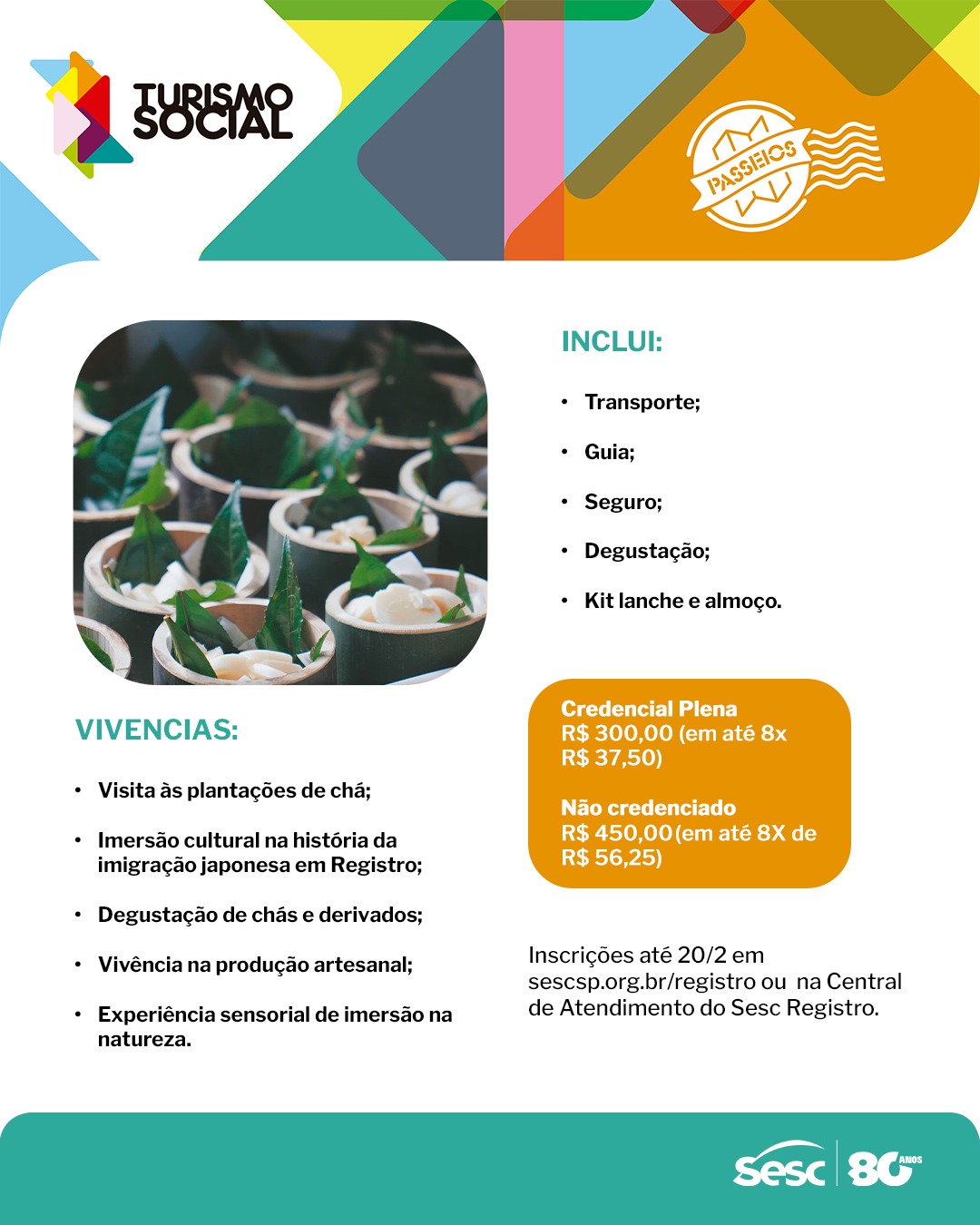 As inscrições seguem abertas até o dia 20 de fevereiro pelo site oficial do Turismo Social do Sesc. Os valores variam entre R$ 300,00 para quem possui a Credencial Plena e R$ 450,00 para o público em geral, com possibilidade de parcelamento em até 8 vezes.